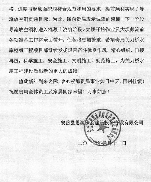 安岳縣思源水利建設投資開發有限公司致工程局賀信