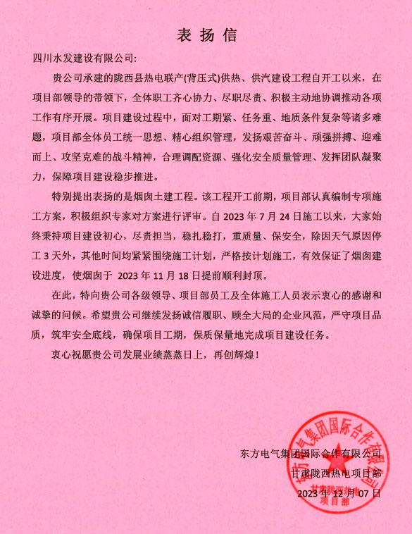 2023年12月7日,東方電氣集團國際合作有限公司致信四川水發建設有限公司,就公司隴西縣熱電聯產(背壓式)供熱、供汽建設工程項目,特別是作為主體工程的煙囪提前三天順利封頂表示感謝。