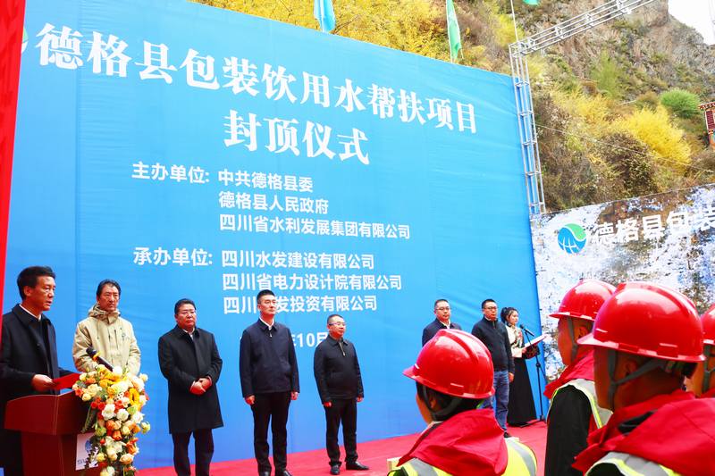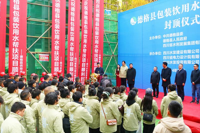 德格縣縣委書記昌呷次稱在講話中代表縣委、縣政府以及德格縣父老鄉親向蒞臨出席活動及關心德格縣發展的領導、來賓表示衷心的感謝和崇高的敬意。他強調,水發集團堅決貫徹省委部署要求,傾注真情實感、投入真金白銀、用力真幫實扶,不斷為鞏固拓展脫貧攻堅成果、全面助推德格縣鄉村振興注入新動力。下一步,期望各方進一步加強工作統籌、力量統籌和資源統籌,攜手構建高質量發展共同體,讓愛心永放光芒、讓真情共筑希望,共同譜寫德格縣高質量發展新篇章;最后,熱烈祝賀并宣布德格縣包裝飲用水幫扶項目封頂儀式圓滿禮成。