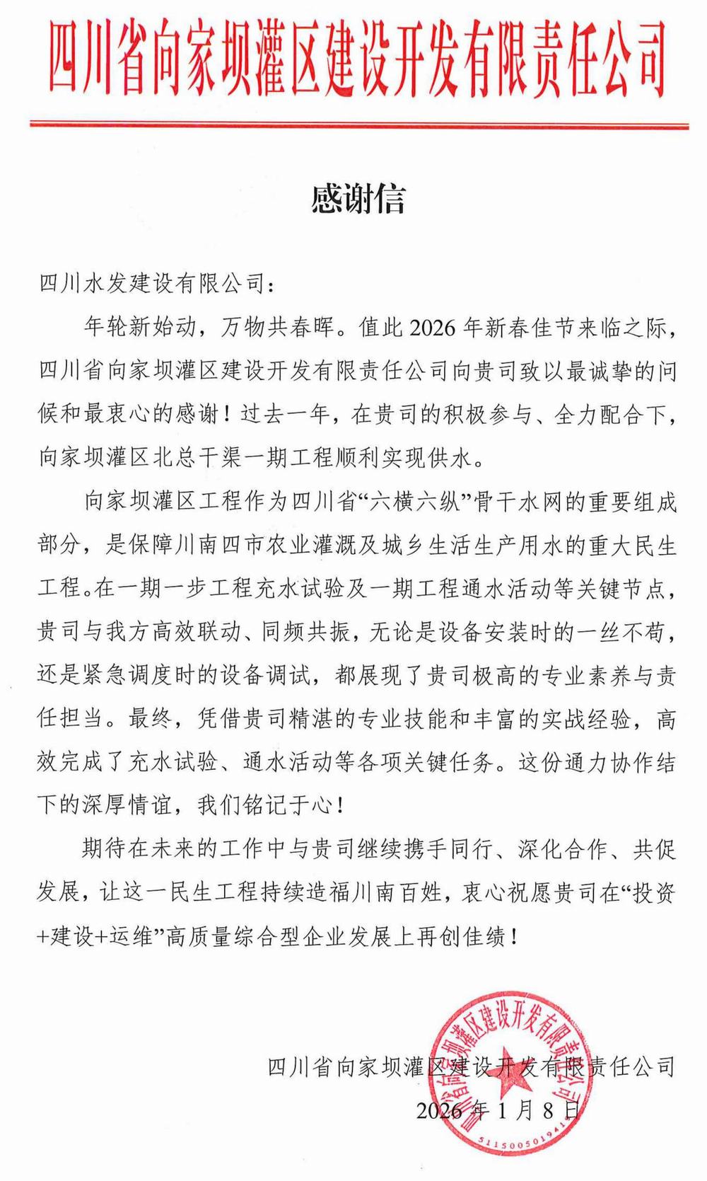 近日,公司收到來自四川省向家壩灌區建設開發有限責任公司的感謝信,信中對機電安裝分公司在向家壩灌區一期一步工程充水試驗、通水活動等各項關鍵任務中展現出的卓越能力與鐵軍風范予以高度贊譽。