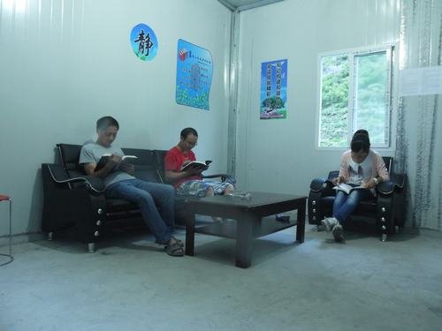 2015年8月12日下班后,局鑫宏公司固滴電站項目部3名員工津津有味的在工地閱覽室看書、工地籃球場上8名員工正在火熱上演一場籃球賽……