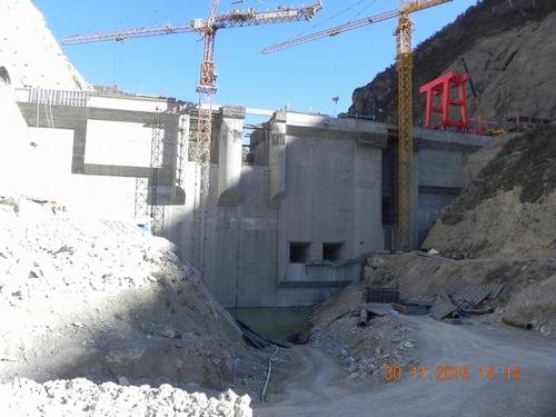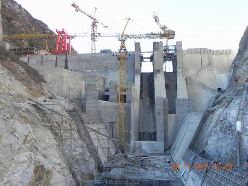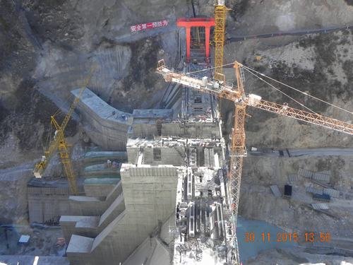 11月30日15時,九龍峽水電站大壩工程4#壩段2#梁吊裝完閉,標(biāo)志著歷時3年艱辛建設(shè)的九龍峽水電站大壩工程已達(dá)到全線封頂目標(biāo)。九龍峽水電站共有9個壩段,壩高62米,壩長158米,混凝土澆筑量約14萬方。