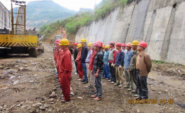 防洪度汛應急演練虛擬背景:2016年5月8日14時10分,第一工程處工會主席、溪電站項目經理部常務副經理李陵接到彝良縣政府防汛抗旱指揮部、彝良縣瑞源水電開發有限公司的通知:由于電站上游出現強降雨,上游電站已開始泄洪,根據氣象部門通報,未來1小時還將有一次大的強降雨,洪水水位將達到防洪高程566.50m,可能引起電站廠房被淹。要求項目部迅速疏散廠房內作業人員和轉移現場的機械設備,材料,再采用編制沙袋臨時加高廠房防洪墻。