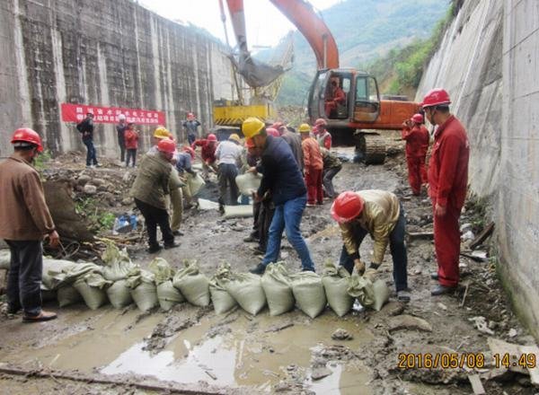 14時12分,常務副經理李陵立即向項目部各部門指示:啟動《2016年防洪搶險應急預案》,對相關人員的具體工作做了進一步明確和安全撤離的要求,20分鐘后,按應急演練分工,撤離工作有條不紊的開展,并迅速撤離了正在作業的人員和設備,40分鐘后完成了對廠房防洪墻的臨時加高,安全人員對施工現場進行警戒、觀察水位上漲情況,李陵向彝良縣政府防汛抗旱指揮部、彝良縣瑞源水電開發有限公司通報防洪度汛應急救援搶險情況。