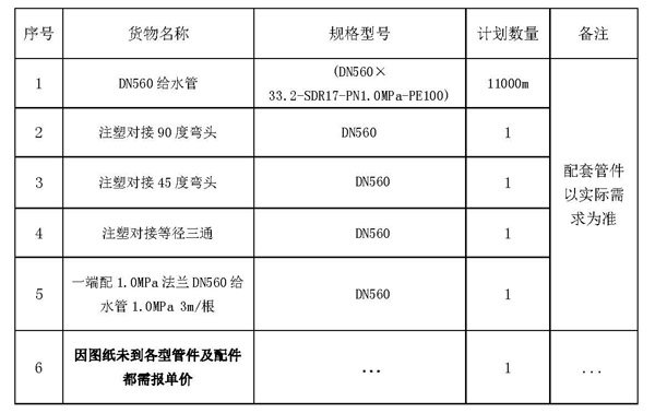 1.2采購范圍:DN560 PN1.0MPa PE管材及管件,PE管總用量約11000米。